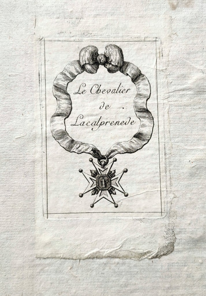 Bel ex-libris du chevalier de Lacalprenède avec le cordon et la Croix de l’Ordre royal et militaire de Saint-Louis.