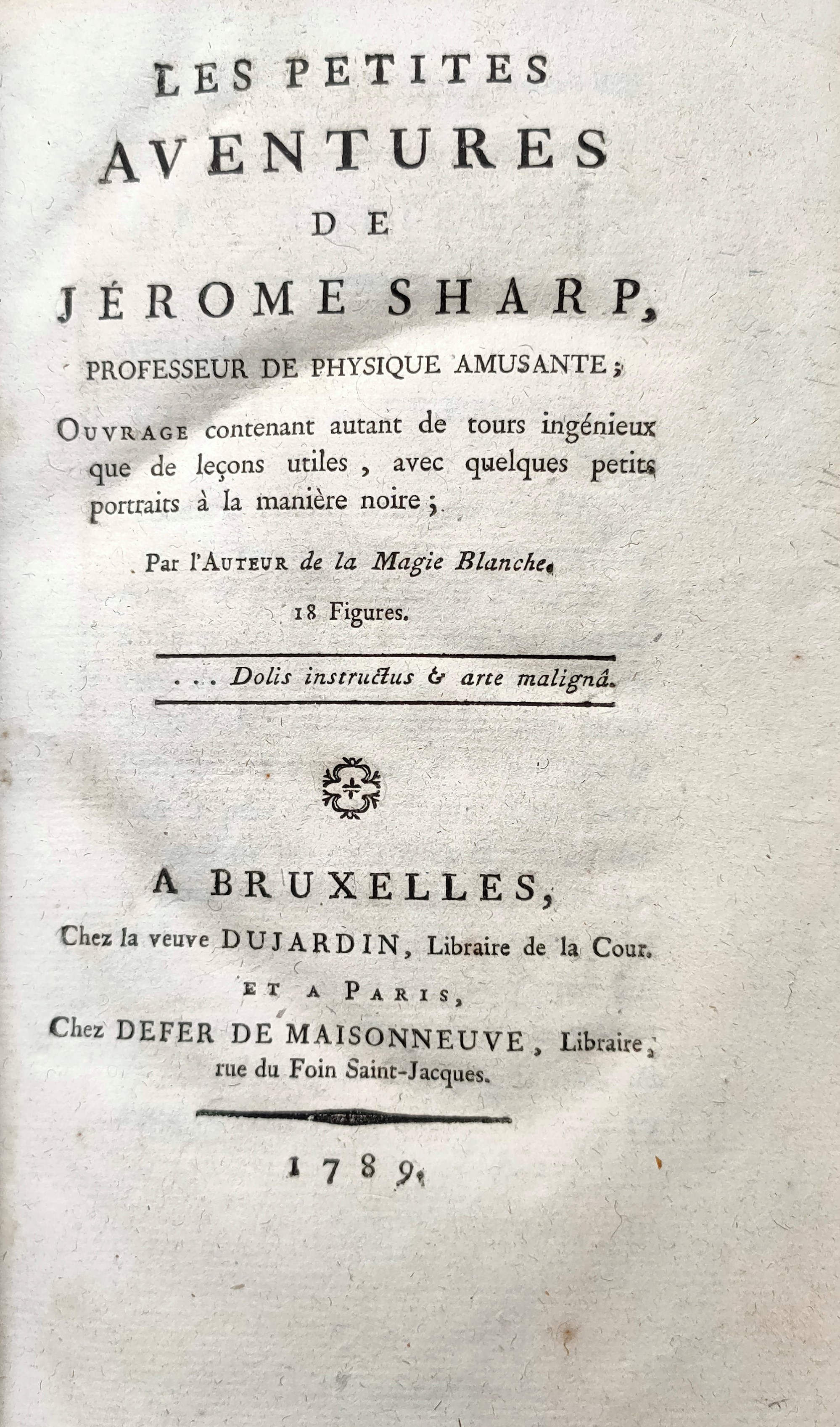 ![[Decremps, Henri]. Les petites aventures de Jérome Sharp, professeur de physique amusante; Ouvrage contenant autant de tours ingénieux que de leçons utiles, avec quelques petits portraits à la manière noire, par l'auteur de La Magie Blanche. In-8, à Bruxelles chez la veuve Dujardin et à Paris chez Defer de Maisonneuve, demi-basane d'époque, dos orné, piède de titre de maroquin vert, titre doré, tranches jaspées, 386 p., illustré d'un frontispice représentant Jérome Sharp voyageant en habit de chasseur et de 18 figures dans le texte. Célèbre ouvrage, écrit par Henri Decremps (1746-1826) de physique amusante et de prestidigitation sous forme de roman et de livre de voyages : Jérôme Sharp, ruiné, forme le projet de partir pour Paris et pour Londres et en route pratique, au grès des rencontres, la récréation mathématique et physique. Petite mouillure au bas du frontispice, sinon très bon état. Bel ex libris du chevalier de Lacalprenede avec le cordon et la Croix de l'Ordre royal et militaire de Saint-Louis.](http://librairiehistoireetsociete.com/wp-content/uploads/2013/01/12.jpg?w=395)