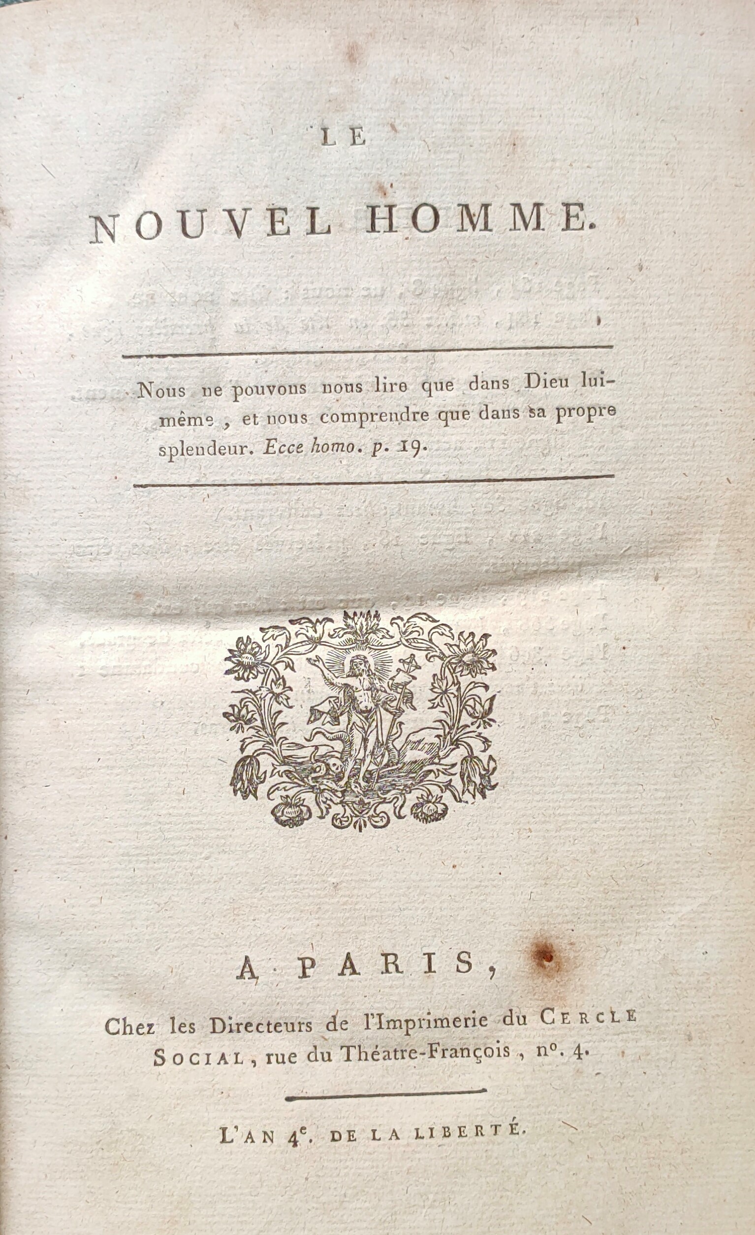 Volume in-8°, Paris, Imprimerie du Cercle Social, an IV de la Liberté [1796], demi-basane vert sombre, dos orné de motifs romantiques dorés, titre doré, [1-1 bl – 2]-432 p. Errata au verso de la page de titre, ornement au titre. (Caillet III, 460).