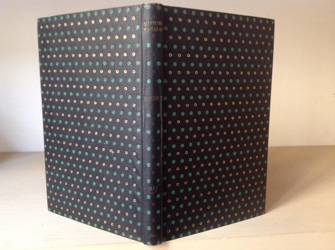 Mallarmé, Stéphane. Poésies – Edition Complète Contenant Plusieurs Poèmes Inédits. Paris: Gallimard, 1945. 12 x 18. Volume in-12, reliure éditeur d’après la maquette de Paul Bonet, fond noir rehaussé de lignes horizontales de points verts et de cercles dorés alternées, titres et date dorés au dos, 169 p. In fine bibliographie de l’édition de 1898. Première édition. Exemplaire N°416 / 1000. Reliure et intérieur en parfait état. Très bel exemplaire.