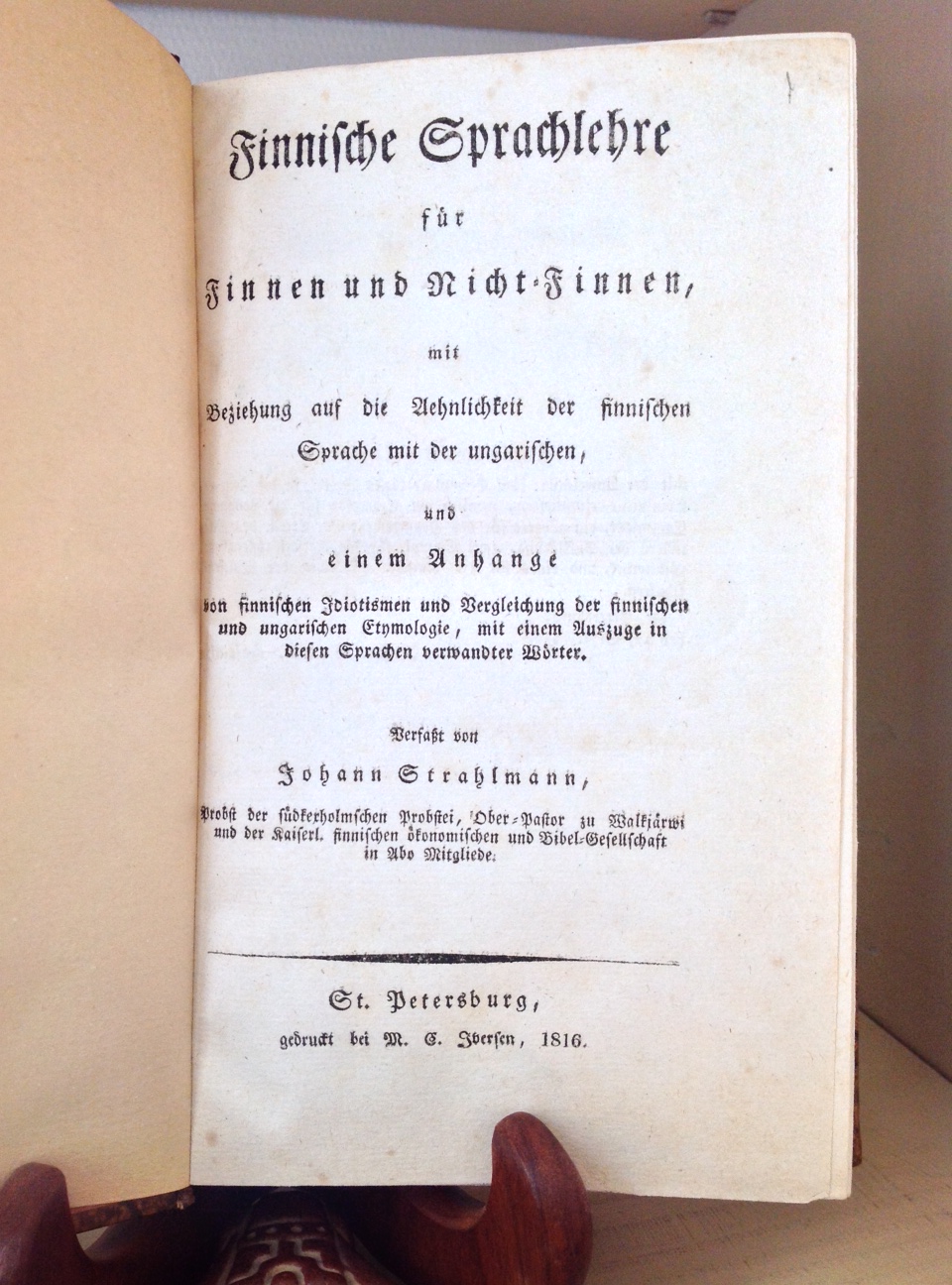 Strahlmann, Johann. Finnische Sprachlehre Für Finnen Und nicht-Finnen Mit Beziehung Auf Die Aehnlichkeit Der Finnischen Sprache Mit Der Ungarischen Und Eine Anhange Von Finnischen Idiotismen Und Vergleichung Der Finnischen Und Hungarischen Etymologie…. St. Petersburg: M. G. Iversen, 1816. 13 x 21. Volume petit in-8, reliure plein cartonnage marbré courant XXe, pièce de titre de cuir rouge, titre, fleuron et date « 1816 » en pied dorés, [5 ff]-V-252-[6 ff.].Rare.