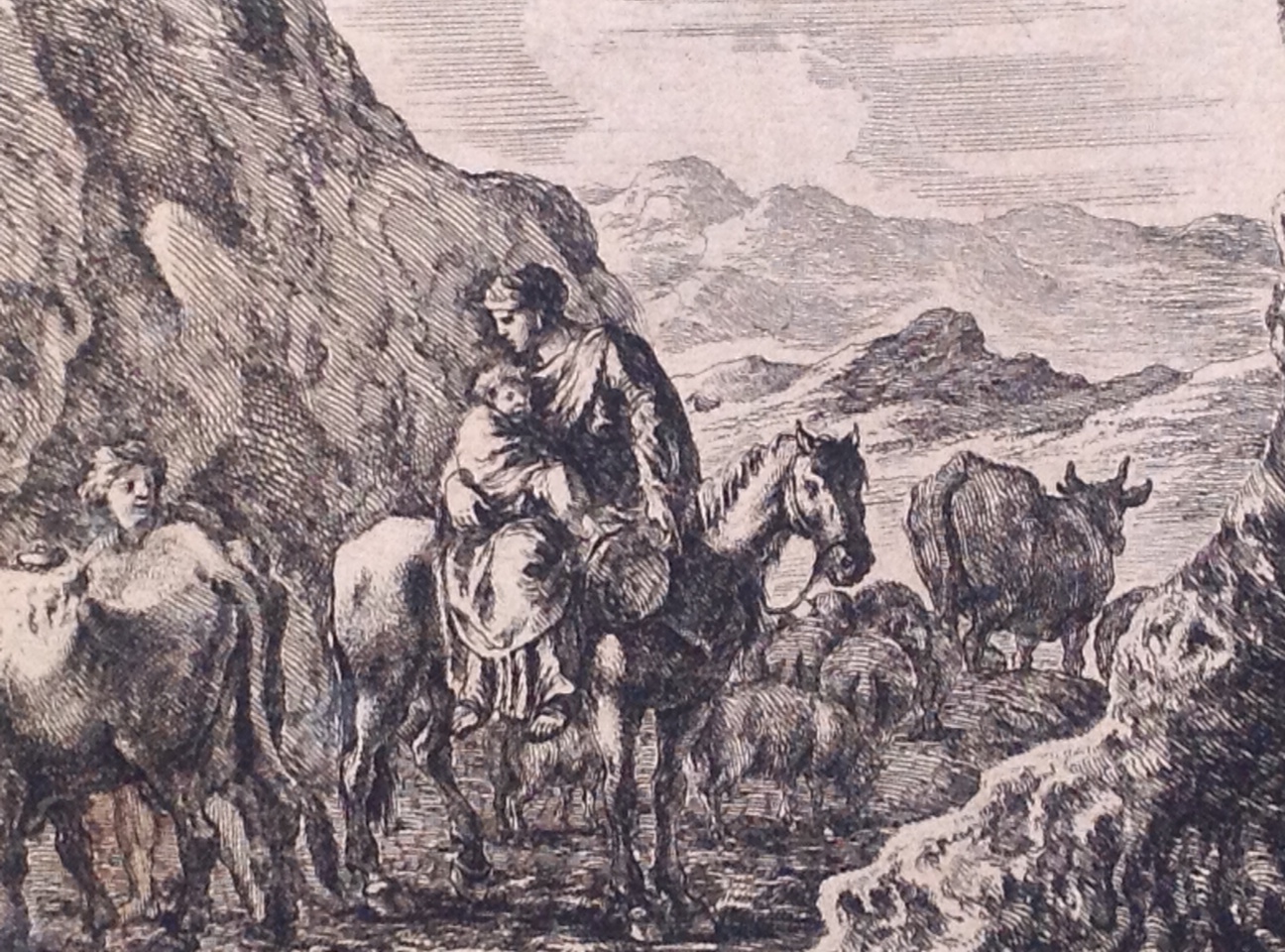 Della Bella, Stefano. La Paysanne à Cheval Avec Un Enfant Dans Ses Bras. Gravure à l’eau-forte du graveur florentin Stefano della Bella (Florence, 1610-1664), milieu XVIIe, 26,3 x 29, représentant une paysanne à cheval avec un enfant dans ses bras, tandis que son homme rassemble un troupeau, avec,au premier plan un vieil arbre, dans un paysage de collines. La gravure fait partie d’une suite de six vues de Rome et de la campagne (De Vesme / Massar, 837). Gravure, sans marge, coupée à la limite de la composition, avec un petit manque dans le coin supérieur gauche, qui ne porte pas atteinte à la qualité de l’ensemble.
