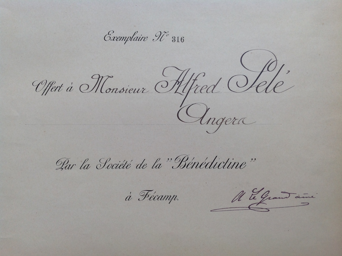 Le Roux, Hugues et Alfred. La Bénédictine de l’ancienne Abbaye de Fécamp. Rouen: Le Cerf et Fils, 1905. Notre exemplaire a été offert à Alfred Pelé (1859-1917), fondateur de la Maison Pelé à Angers « la plus importante épicerie de France en province » et grande figure du commerce et des affaires, d’Angers et du grand ouest à la fin du XIXe siècle.