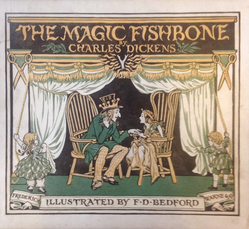 Dickens, Charles. The Magic Fishbone. ill. F.D. Bedford. London – New-York: Frederick Warne & Co, 21,5 x 19. In-4, reliure cartonnage de l’éditeur, s.d. [1921], couverture illustrée, dos de toile verte au titre noir, [24 p.], 8 planches illustrées par F.D. Bedford, belles pages de garde avec le monogramme CD. « From ‘Holiday romance,’ first published in 1868. » – At head of title: Romance from the pen of Miss Alice Rainbird, aged seven. Exemplaire en très bon état.