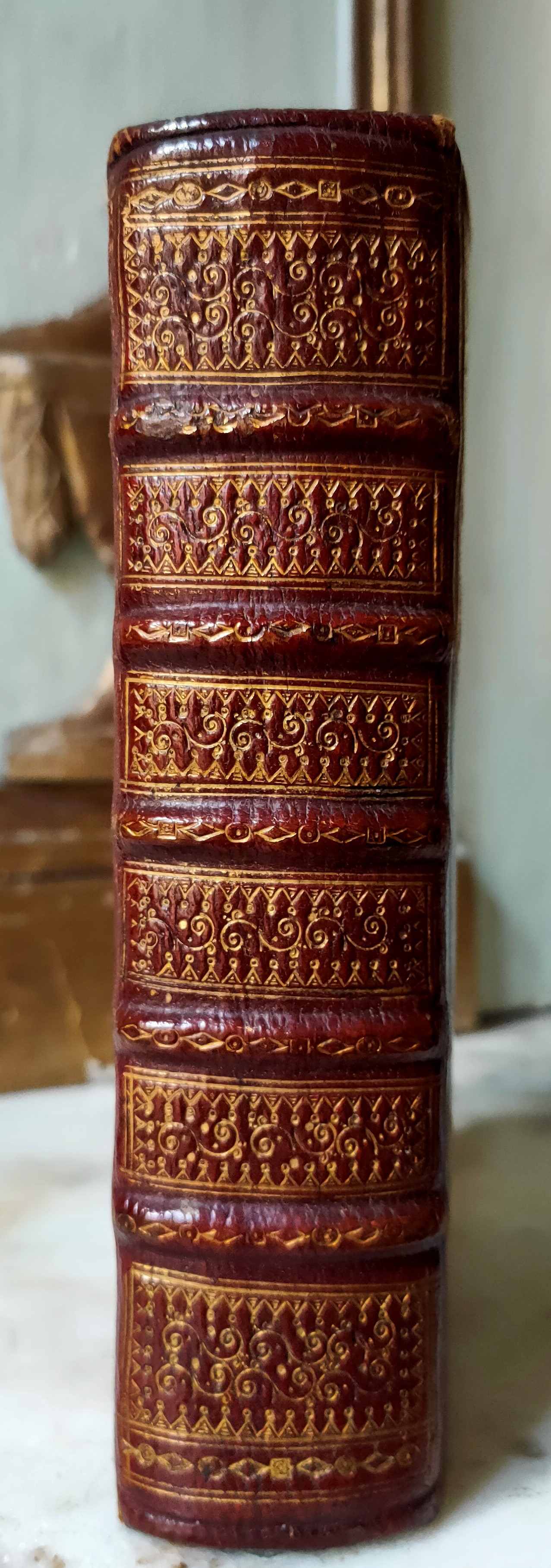 Petit in-8, reliure plein maroquin bordeaux de l’époque, dos à 5 nerfs sans titre orné aux petits fers, plats encadrés de trois doubles filets dorés « à la Du Seuil » avec des fleurons aux angles des deux encadrements intérieurs, tranches bordeaux, [32]-631-[25], 55 gravures en frontispice de chaque lectio à partir du livre II. Deuxième édition. La première date de 1629.