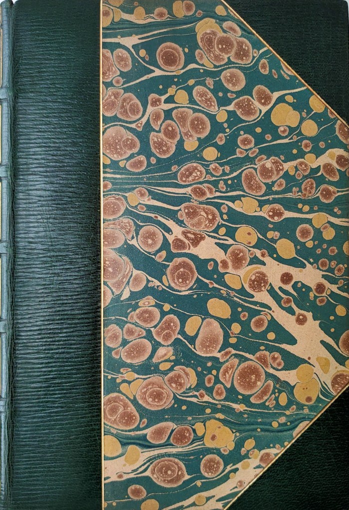 In-8, reliure demi-maroquin vert à grains longs et à coins, dos à cinq nerfs, caissons ornés de motifs floraux dorés, date dorée en queue, filets dorés sur les plats, tête dorée, XVI-267 p., couverture conservée.