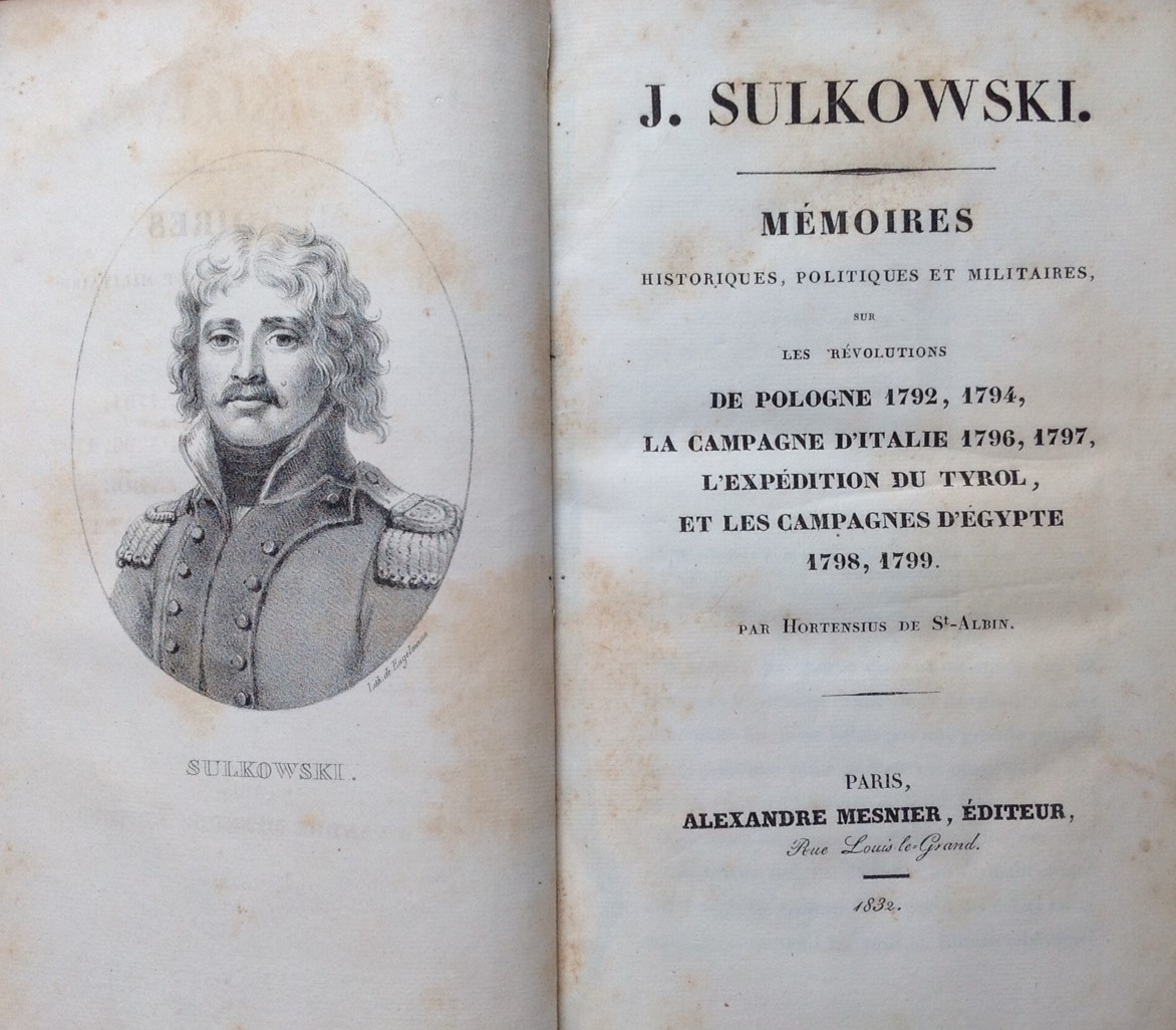 Saint-Albin, Hortensius de – [Sulkowski, Joseph]. J. Sulkowski – Mémoires historiques, politiques et militaires sur les révolutions de Pologne 1792, 1794, la campagne d’Italie 1796, 1797, l’expédition du Tyrol et les campagnes d’Égypte 1798, 1799. Paris: Alexandre Mesnier, 1832. 12,5 x 20.