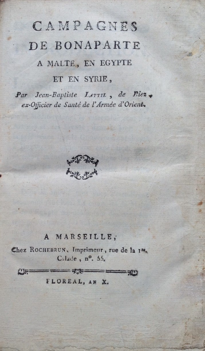 Lattil, Jean-Baptiste. Campagnes De Bonaparte à Malte, En Egypte et En Syrie. Marseille: Rochebrun, 1802.