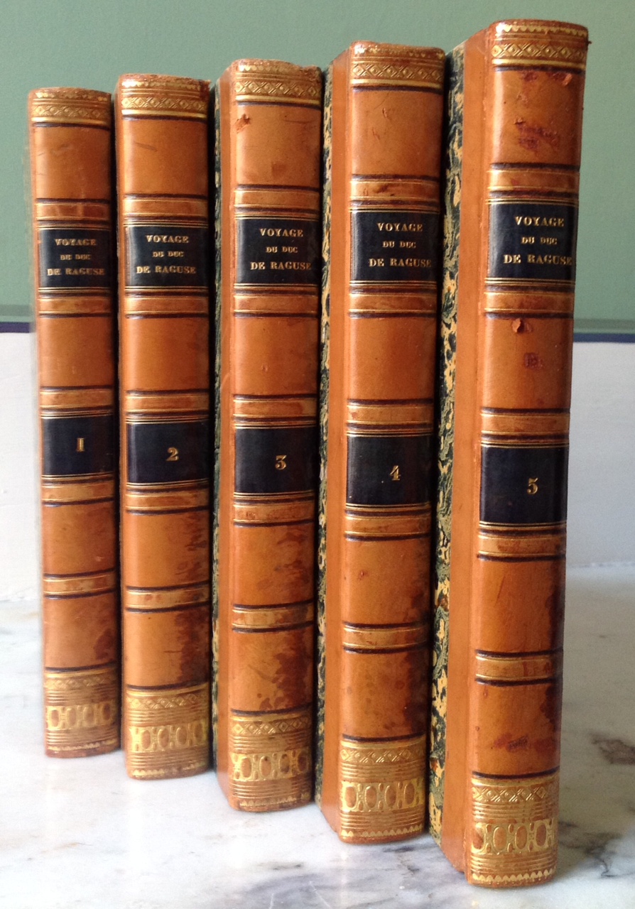 Edition originale bien complète du rare cinquième volume intitulé « Voyage en Sicile » publié en 1838, avec les tableaux statistiques, les notes sur Murat et la table alphabétique in fine. Mention de première édition en tête du tome III et de deuxième édition en tête du tome IV. Nous joignons, dans une reliure différente (demi-basane bleu sombre de l’époque ornée de décors dorés romantiques, plats marbrés) le rare atlas in-4 qui était vendu séparément: il est composé du portrait du duc de Raguse en frontispice, de 12 planches sous serpentes (vues d’Egypte et de Syrie par Mayer, Dauzats et Vasserot) et de 7 cartes, dont quatre en double page et 3 dépliantes concernant la Sicile, l’ensemble sur vélin fort. La première (et donc huitième) manque et a été remplacée par sa copie moderne sur papier fort.