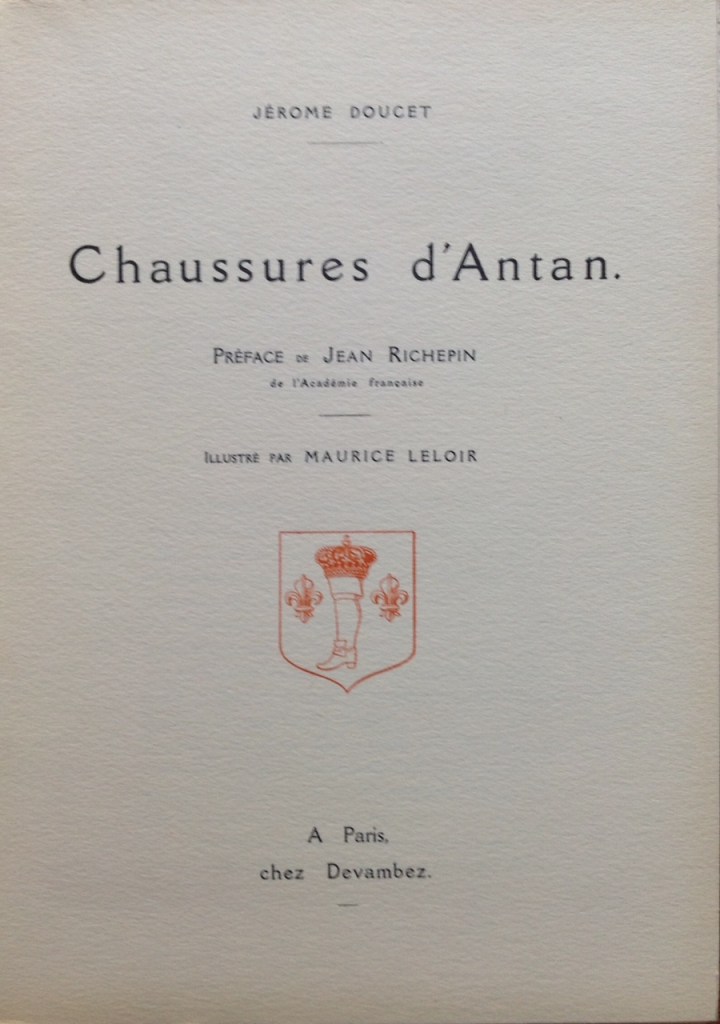 Doucet, Jérôme. Chaussures D’antan. Illustrations de Maurice Leloir. Paris: Chez Devambez, 1913. 19 x 26. . Broché, in-8, couverture rempliée, 40 p., sur papier fort, illustré de 19 vignettes in texte (tirage orangé) et quatre planches hors texte en couleurs par Maurice Leloir, et quatre planches contrecollées (reproductions photographiques des chaussures d’époques, du XVIe au XIXe siècle). Préface de Jean Richepin. « Ce volume a été édité par les soins et aux dépens de la Maison Coquillot, au 75 de l’Avenue des Champs-Élysées à Paris ».