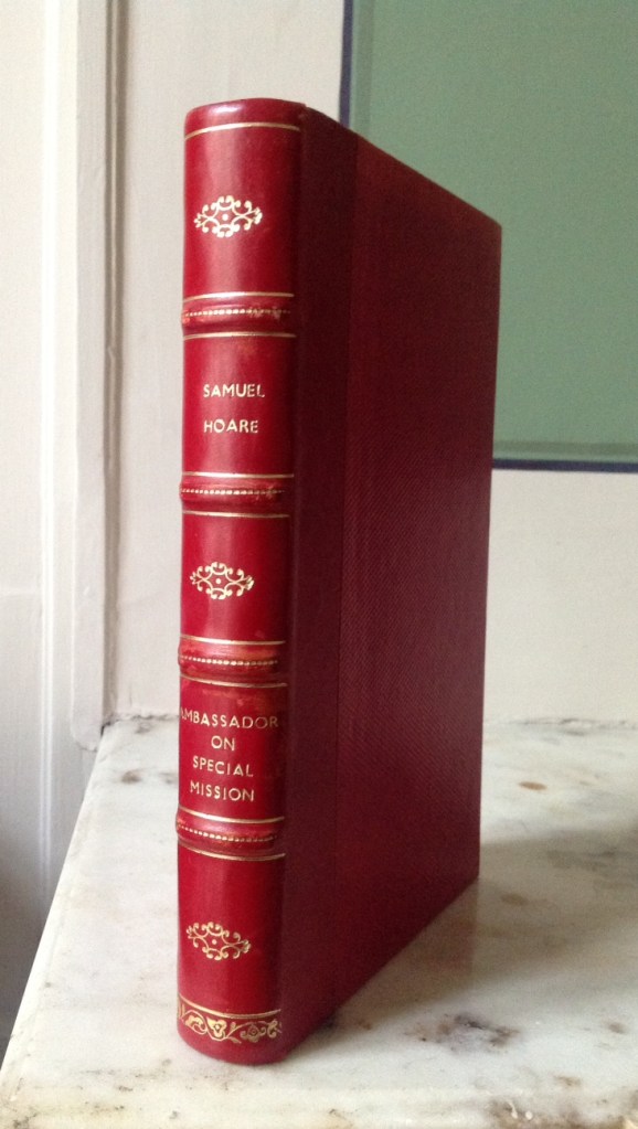 Hoare, Samuel [Eduardo Brazao]. Ambassador on Special Mission. London: Collins, 1946. Edition Originale. 14 x 21. In-8, reliure demi-veau rouge, dos à quatre nerfs soulignés de filets dorés, fleurons et frises dorés, 320 pp. Appendices, index.