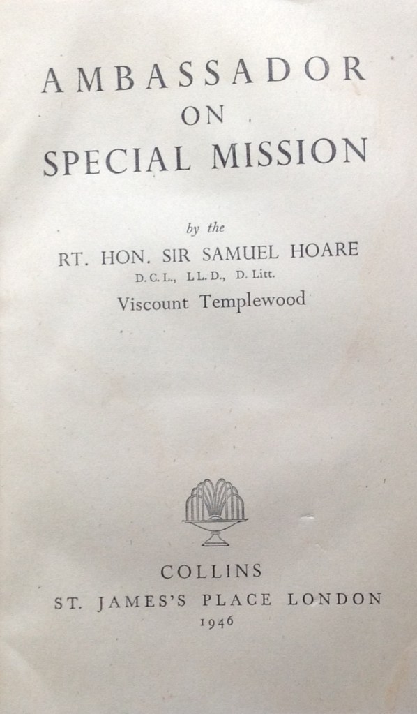 « Ambassador on special mission » est le récit passionnant de la mission diplomatique difficile, que mena l’ambassadeur britannique à Madrid Sir Samuel Hoare (1880-1959) dans l’Espagne de Franco de 1940 à 1944. Hoare, avec succès, a pesé de tout son poids et de toute son habileté de diplomate, à travers les multiples variations de l’environnement politique et militaire, afin d’écarter l’Espagne des puissances de l’Axe et de maintenir l’Espagne dans une relative neutralité.