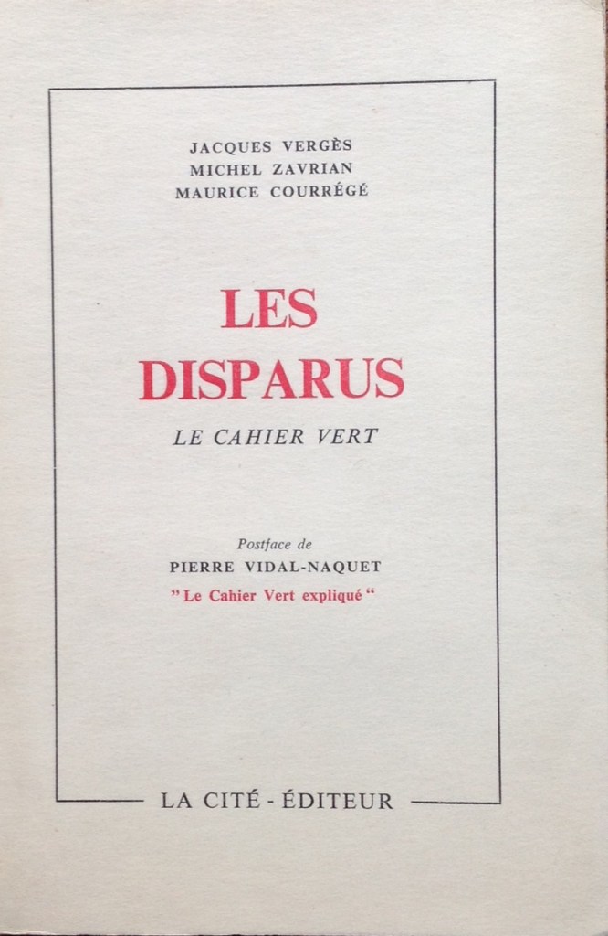 Vergès, Jacques / Zavrian, Michel / Courrégé, Maurice. Les Disparus – Le Cahier Vert. Lausanne: La Cité Editeur, 1959. 12,5 x 19. Broché, 116-[4]. Postface de Pierre Vidal-Naquet « Le cahier vert expliqué » – 16 hors-texte. Achevé d’imprimer le 10 décembre 1959 – Edition originale. Le livre comprend 175 plaintes pour disparition après enlèvement par les militaires, recueillies à Alger en août 1959 par les trois auteurs, avocats du FLN. Exemplaire non coupé en excellent état.