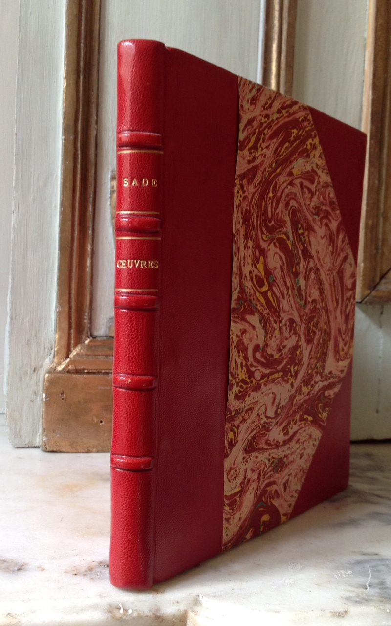 In-4, s.d. [1930], mention factice d’impression sur les « Presses de la Société des Amis du Crime, rue de l’Echaudé, à Paris, et terminé le 6 novembre 1790 », reliure demi-maroquin rouge à coins, dos à cinq nerfs orné de filets dorés, gardes marbrées, signet de soie, 87 pp. Couverture conservée.