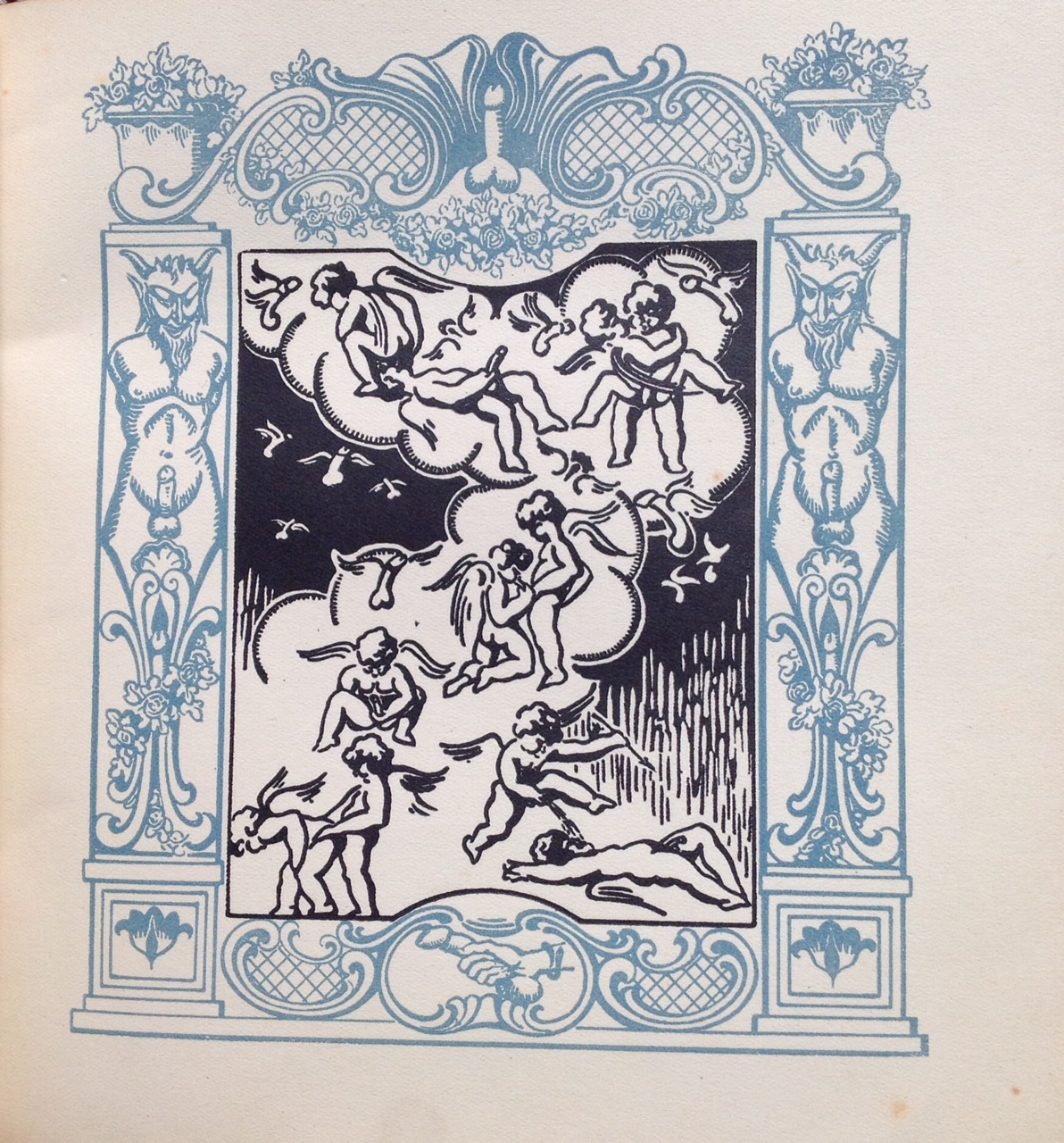 12 bois gravés hors-texte composés de scènes orgiaques en noir encadrées de faunes phalliques dans un décor bleu. Edition limitée à 550 exemplaires, celui-ci étant un des 500 exemplaires sur vélin blanc, portant le numéro 514. Extrait de la troisième partie de » l’histoire de Juliette ou les prospérités du vice », parue début 1800. Exemplaire en très bon état dans une reliure de qualité. Curiosa.