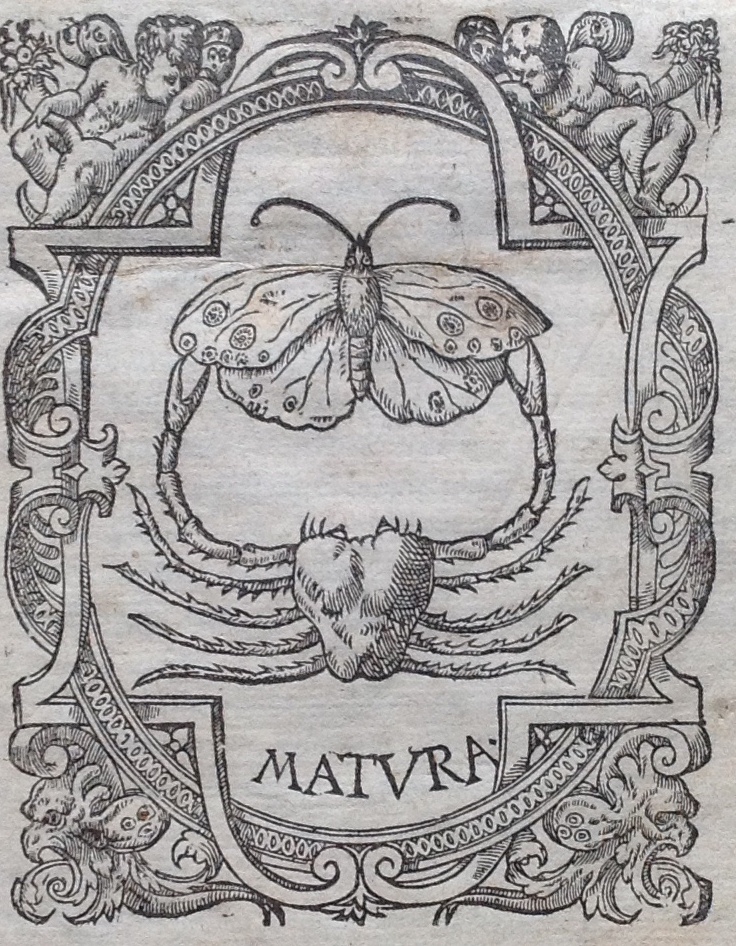 Marque d’Antoine de Harsy, sous la figure d’un crabe tenant par les ailes un papillon accompagnée de la devise « Matura » [Celeritas], qui associe la lenteur, la prudence du crabe à la vitesse, la légèreté, sinon même l’irréflexion du papillon. (Frontispice « Julii Clari Patritii Alexandrini [Julius Clarus] …Receptarum Sententiarum Opera Omnia / Ioannis Baptistae Baiardi…additiones et Annotationes Ad Julii Clari Receptarum Sententiarum Librum Quintum, Sive Practicam Criminalem, Lugduni, 1609« ). 500,00 €