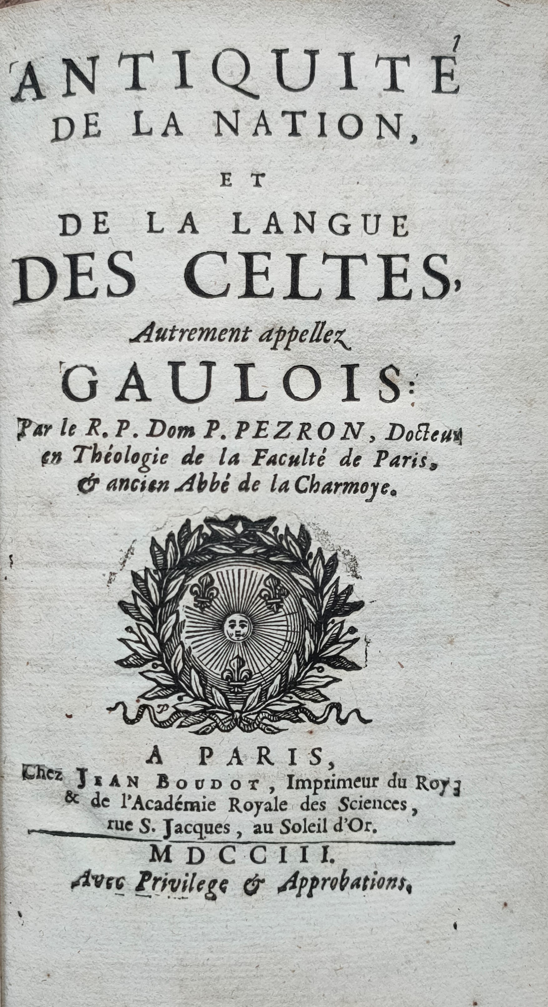 Pezron, Paul (R.P. Dom). Antiquité de la nation et de La langue des Celtes, autrement appellez Gaulois . Paris: Chez Jean Boudot, 1703. 10 x 17.