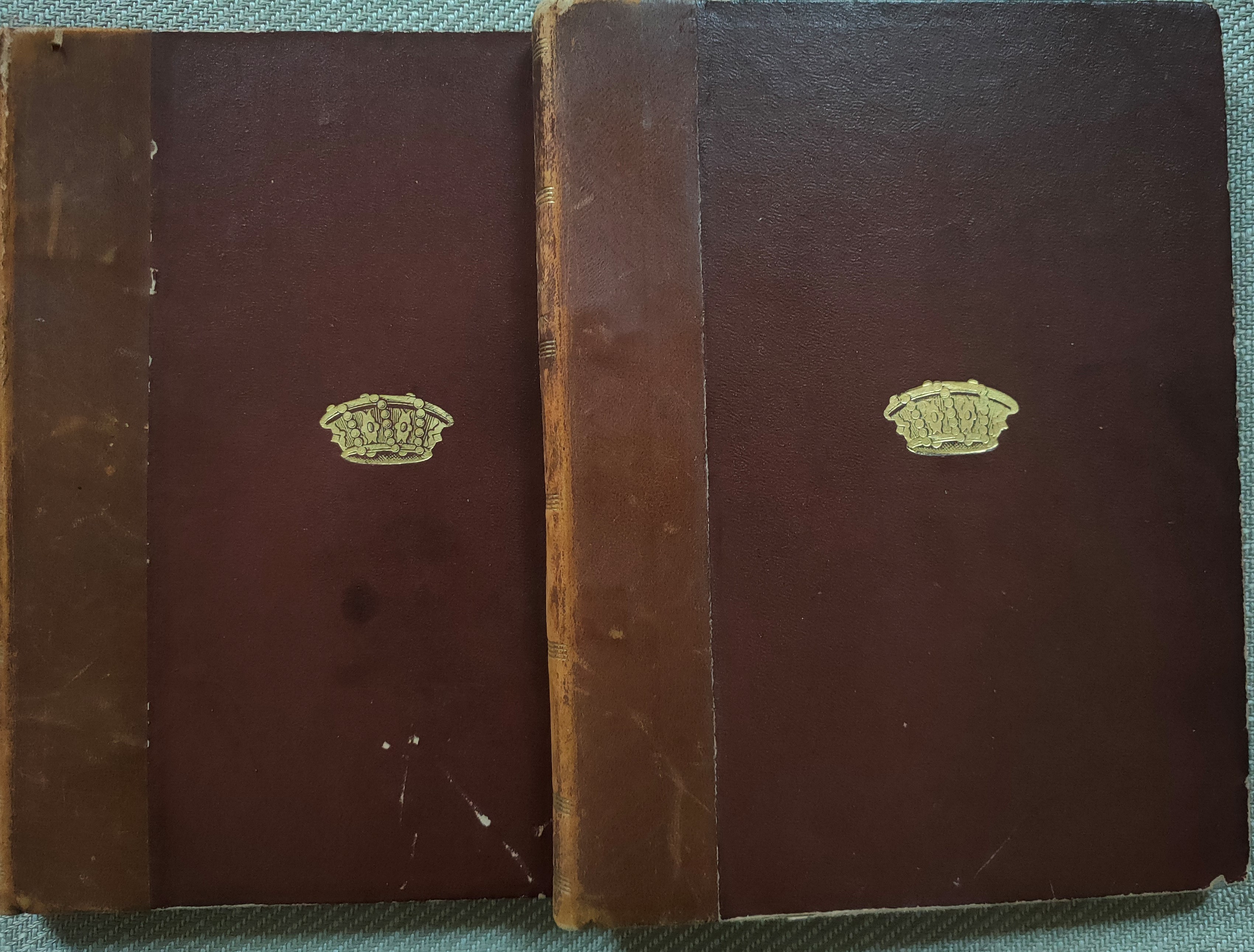 Deux volumes in-4 reliés en demi-basane fauve, dos lisses ornés de filets dorés, auteur, titre et tomaison dorés, couronne de baron dorée sur les plats supérieurs, tranches rouges, gardes marbrées, constitués de deux cahiers manuscrits d’une écriture ample et lisible, respectivement de [1]-104-[2] , et de 140-[1] feuillets numérotés, soit 208 et 280 pages. Le premier cahier est précédé d’une note manuscrite intitulée « Critique de ma mère, Marguerite Auffray-Lapointe » datée du jour de Noël 1920, et de la « Réponse à la critique que ma chère mère a écrite à la page précédente » datée et signée, Neuilly, janvier 1921. Il contient 8 photos de petit format collées dans le texte (ff. 58,v. et 59, r.) ou in fine. Le deuxième cahier contient deux croquis de cartes, une petite carte contrecollée, quelques collages, une photo de petit format, trois coupures de journaux datées de février 1917 et in fine, repliée, une « Permission exceptionnelle de trois jours pour mariage » datée du 30 novembre 1918. Une note manuscrite « Quelques objets rapportés d’Orient » est collée sur le dernier contre plat.