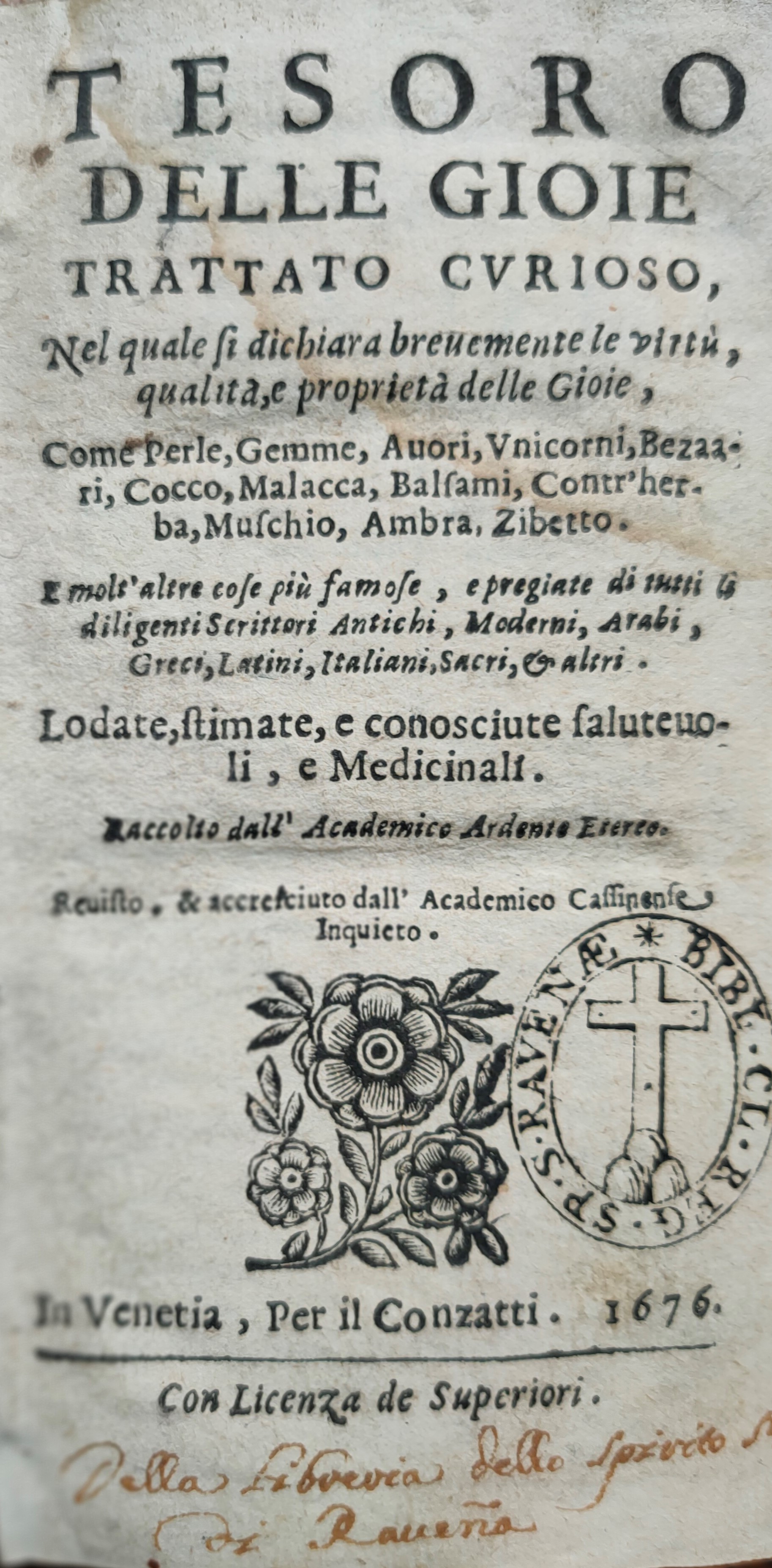 [Ardemani, Giovanni Battista – Arnobio, Cleandro]. Tesoro delle Gioie : trattato curioso, nel quale si dichiara breuemente le virtù, qualità, e proprietà delle Gioie […] Raccolto dall’academico Ardente Etereo. Reuisto, & accresciuto dall’academico Cassinense Inquieto.. In Venetia: Per Il Conzatti, 1676.