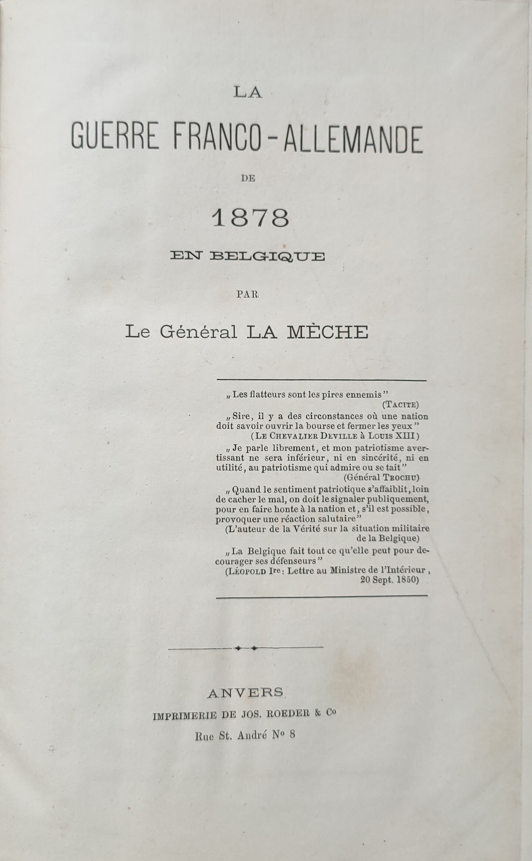 Brialmont, Général Alexis] Général La Mèche. La Guerre Franco-Allemande De 1878 En Belgique. Anvers: Imprimerie de Jos. Roeder & Cie, 1878. 14 x 20,5.