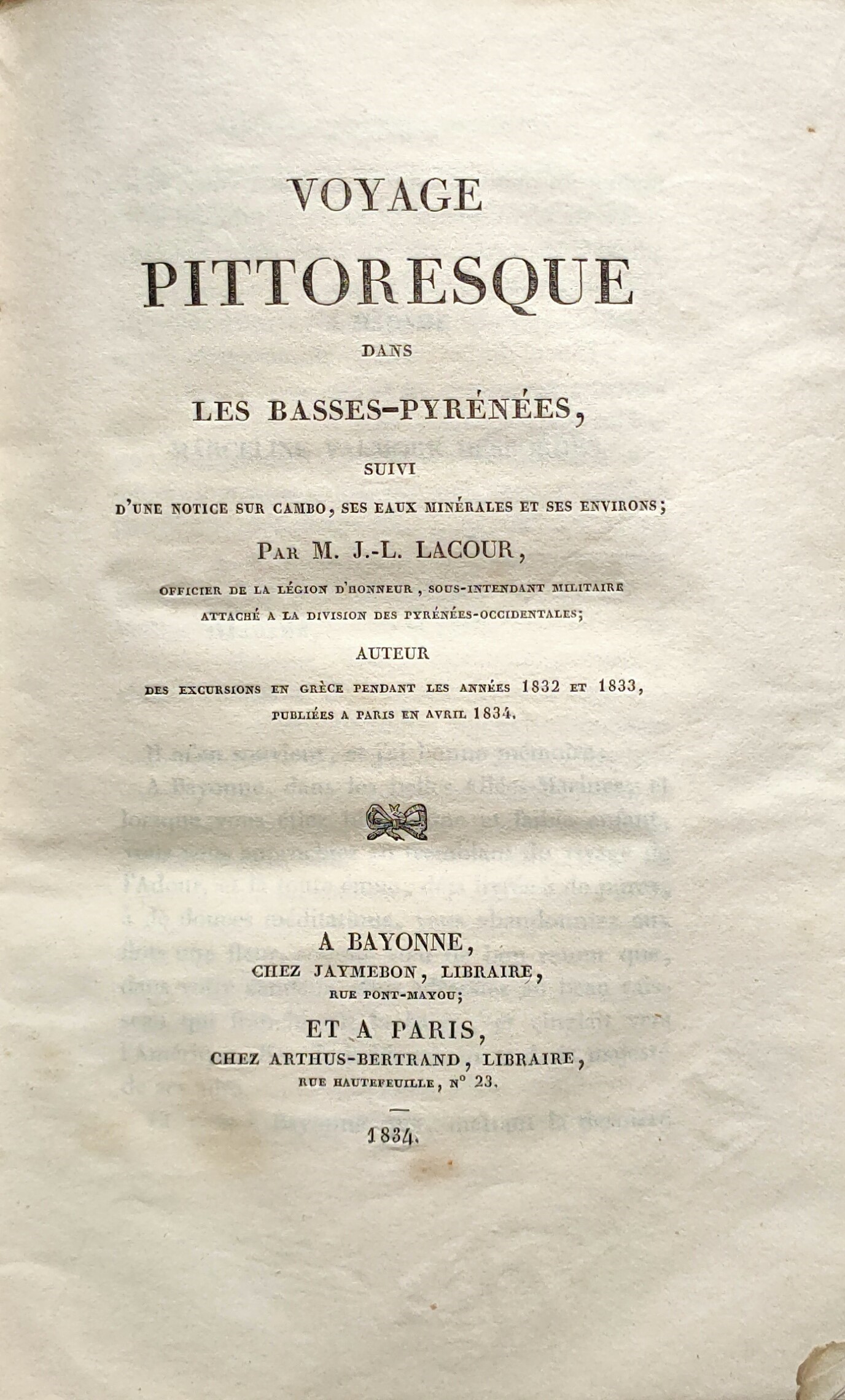 Lacour, Jacques-Louis (1778-1849). Voyage Pittoresque Dans Les Basses-Pyrénées, Suivi d’une notice sur Cambo, ses eaux minérales et ses environs. . Bayonne – Cambo – Paris: Jaymebon – Fagalde – Arthus-Bertrand, 1834.