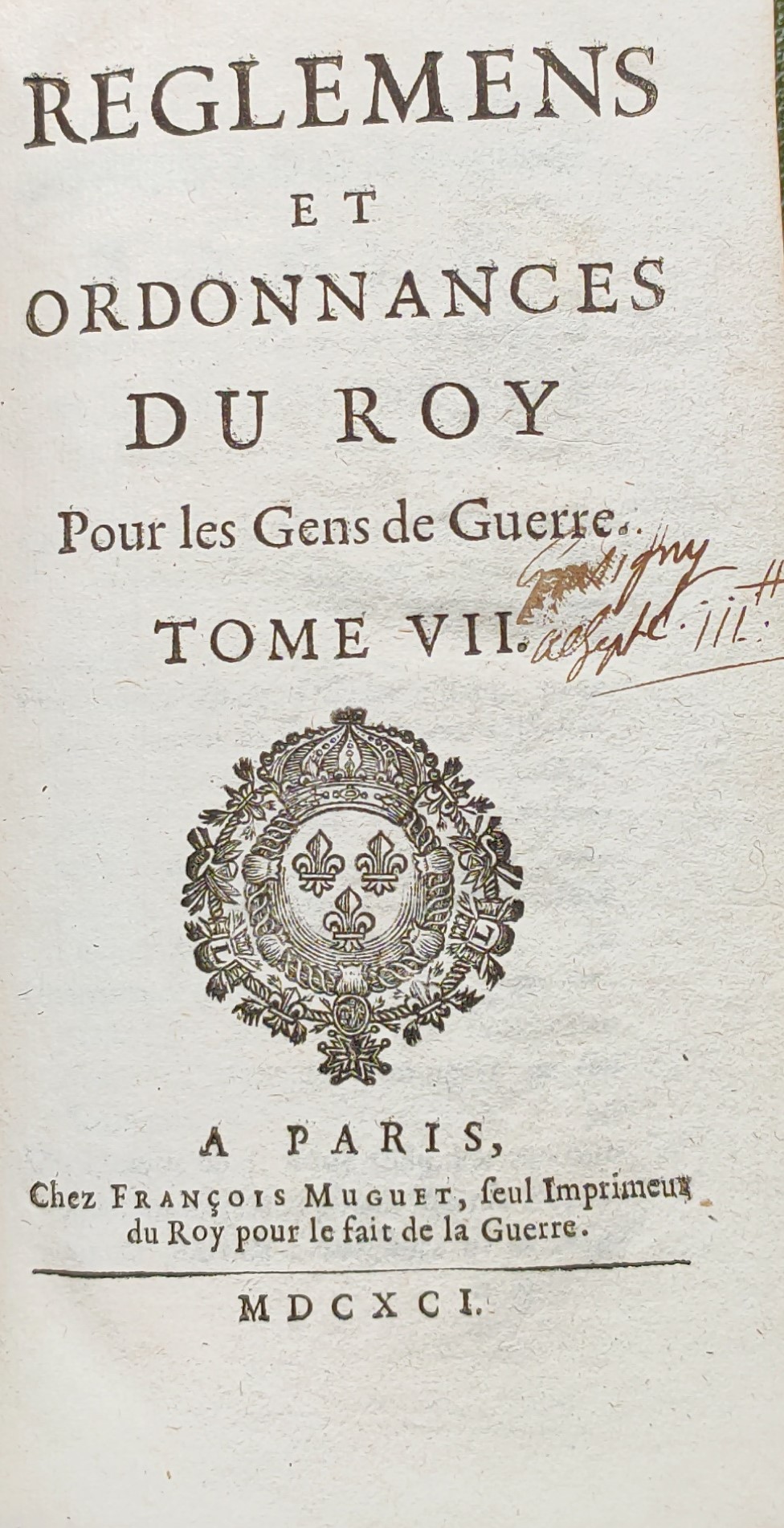 – Tome 6. De 1686 à 1689, Paris, 1689, [18]-327-[15] pp., suivi du Règlement général du Roy pour le Régiment de ses Gardes Françoises, A Versailles, chez François Muguet, 1692, [6]-134 pp., avec un f. bl. entre les pages 126 et 127.