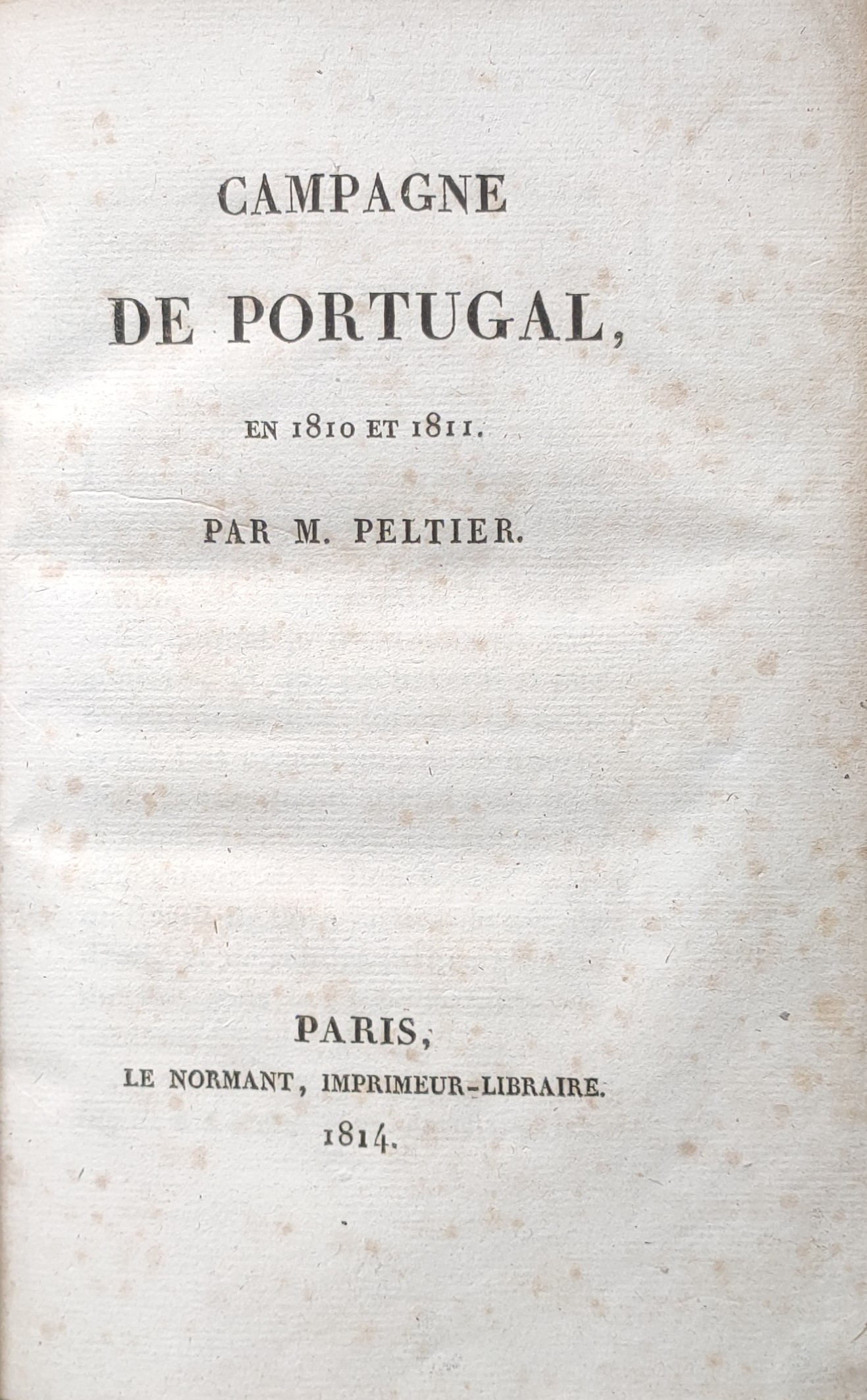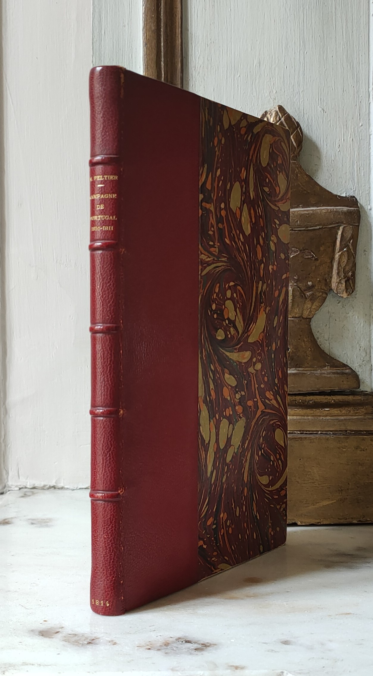Peltier, Jean-Gabriel. La Campagne De Portugal En 1810 et 1811. Paris: Le Normant, 1814. 14 x 21. In-8, reliure demi-maroquin cerise de la fin du XIXe, dos à cinq nerfs, auteur et titre dorés, plats et gardes marbrés, XII-9-120 pp.
