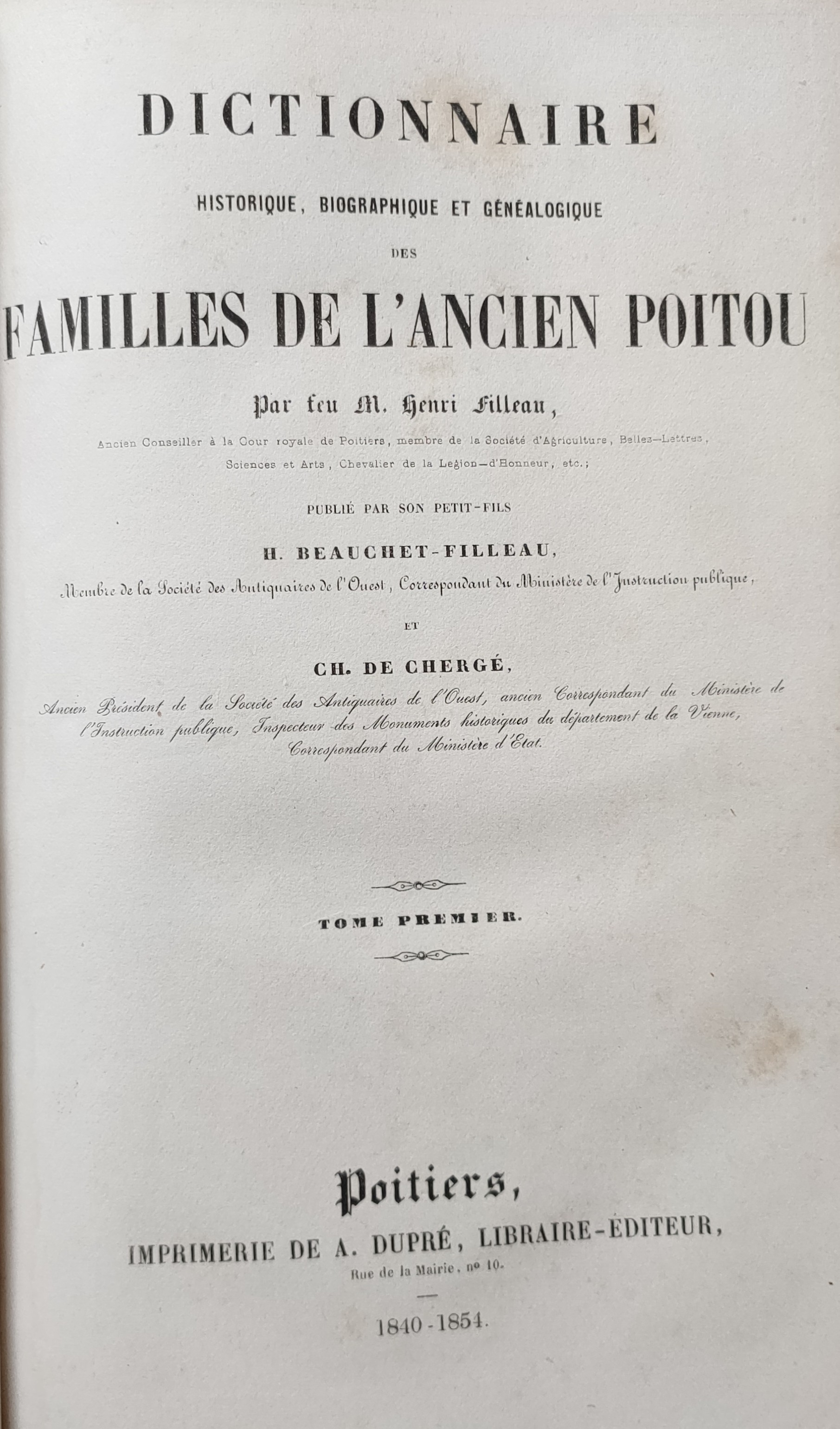 Beauchet-Filleau, H. / de Chergé, Ch.. Dictionnaire Historique, Biographique et Généalogique Des Familles De L’ancien Poitou – 2 Volumes. Poitiers: Imprimerie De A. Dupré, 1840.