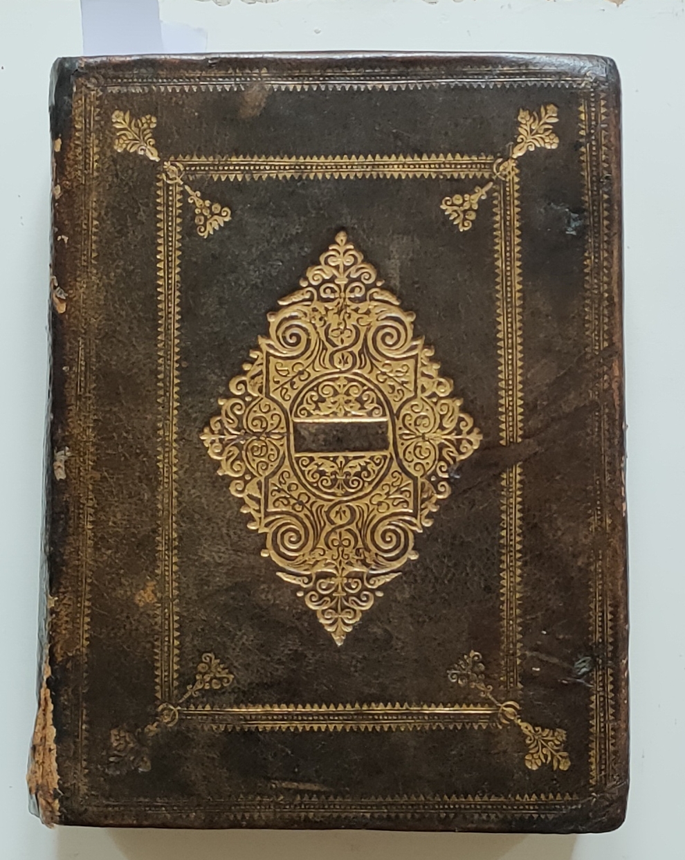 Fort in-8 (17,5 x 23,5), reliure plein maroquin glacé olive sombre de l’époque, dos long sans titrage segmenté par six dentelles dorées filigranées formant des espaces décorés d’un ornement doré encadré par six points losangés dorés, plats encadrés d’une double dentelle dorée filigranée, doubles bouquets floraux dorés aux angles du cadre intérieur, important décor doré losangé au centre des plats, traces d’anciens lacets, toutes tranches dorées. [2] ff., bl., [4] ff. ( titre, épitre dédicatoire, prélation), 1063-[1] pp.