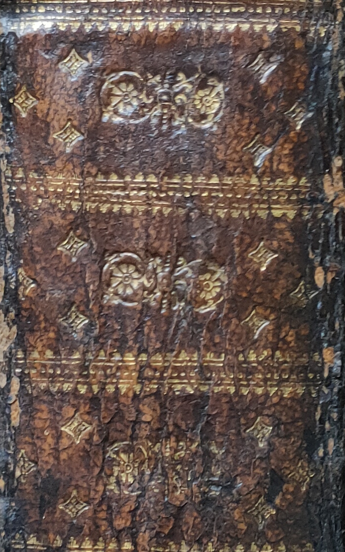 Intéressante reliure, restaurée anciennement notamment en queue et en tête et coins, mors fendus, légères épidermures sur le plat supérieur, ex-libris sur le premier contreplat.